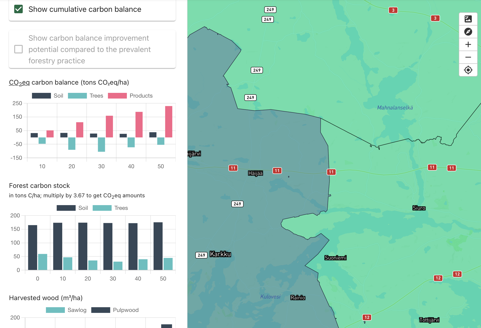 Supported by the European Space Agency, and Business Finland the Forest Map is an open-source mapping tool for assessing the carbon balance, biodiversity, and water impact of forests over their lifecycle. It presents forest modelling based on open spatial data from the Finnish Forest Centre and enables data refinement and forest planning. The service is still in the development phase.