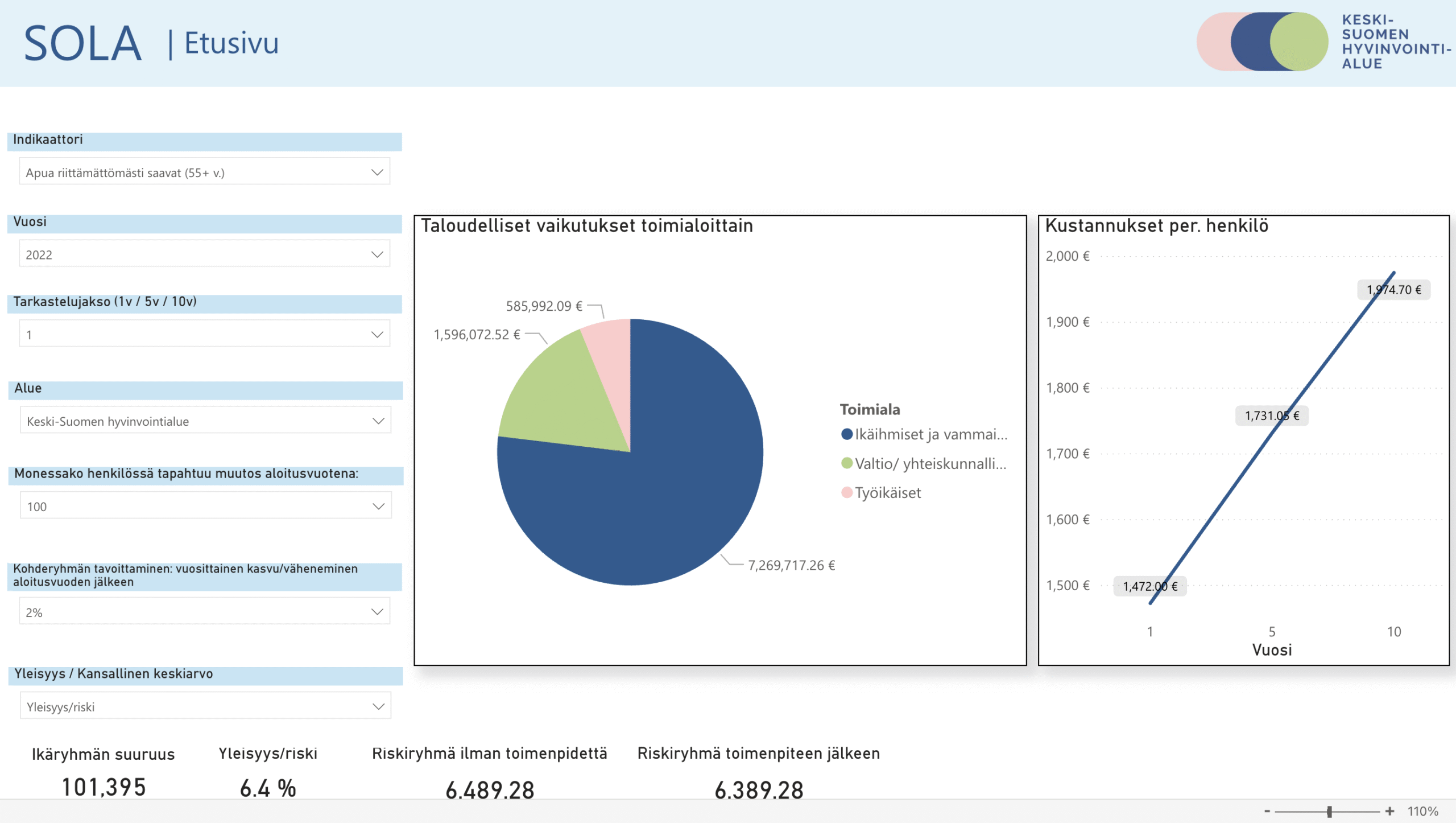 SOLA enables municipalities and wellbeing counties to assess long-term social and economic impacts of policy decisions. The open-source tool supports prioritisation of actions that improve wellbeing and reduce costs through data-driven visualisation and planning.